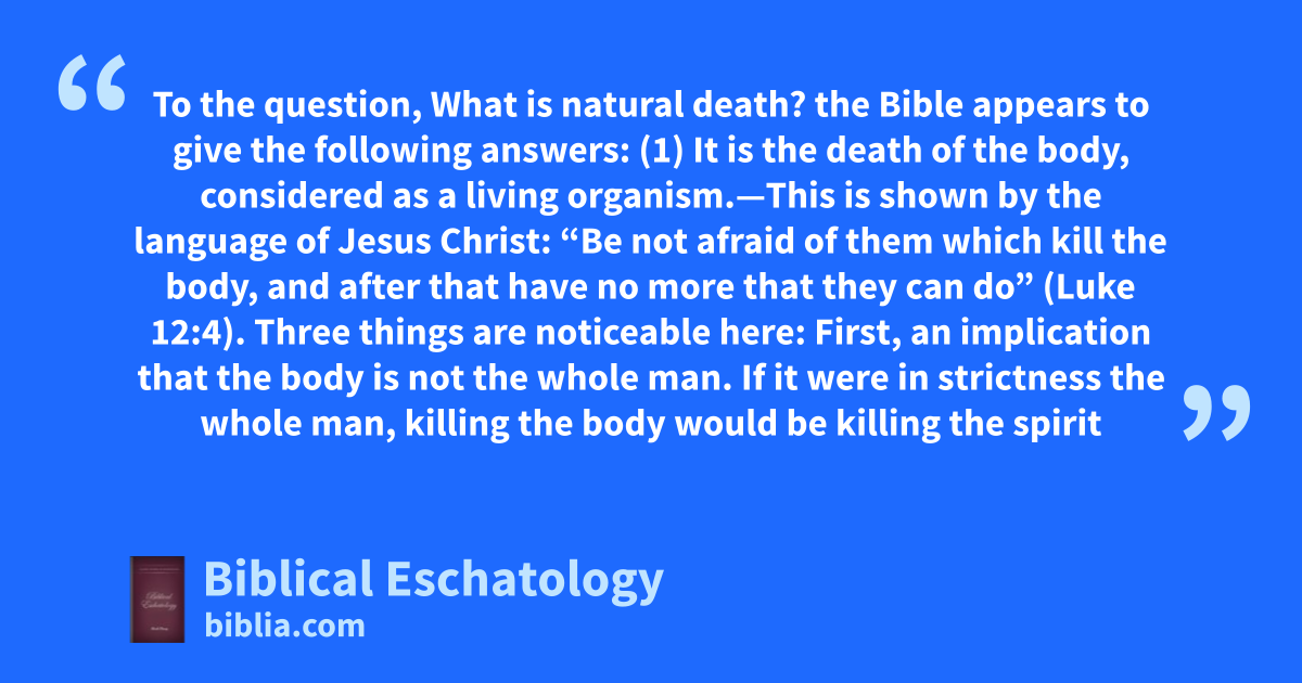 To the question, What is natural death? the Bible appears to give the following answers: (1) It is the death of the body, considered as a living organism.—This is shown by the language of Jesus Christ: “Be not afraid of them which kill the body, and after that have no more that they can do” (Luke 12:4). Three things are noticeable here: First, an implication that the body is not the whole man. If it were in strictness the whole man, killing the body would be killing the spirit