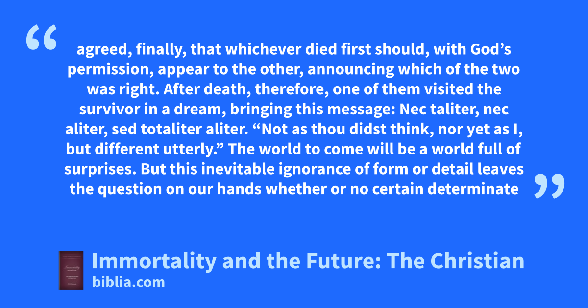 agreed, finally, that whichever died first should, with God’s permission, appear to the other, announcing which of the two was right. After death, therefore, one of them visited the survivor in a dream, bringing this message: Nec taliter, nec aliter, sed totaliter aliter. “Not as thou didst think, nor yet as I, but different utterly.” The world to come will be a world full of surprises. But this inevitable ignorance of form or detail leaves the question on our hands whether or no certain determinate