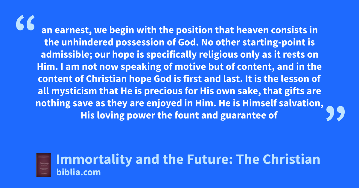 an earnest, we begin with the position that heaven consists in the unhindered possession of God. No other starting-point is admissible; our hope is specifically religious only as it rests on Him. I am not now speaking of motive but of content, and in the content of Christian hope God is first and last. It is the lesson of all mysticism that He is precious for His own sake, that gifts are nothing save as they are enjoyed in Him. He is Himself salvation, His loving power the fount and guarantee of