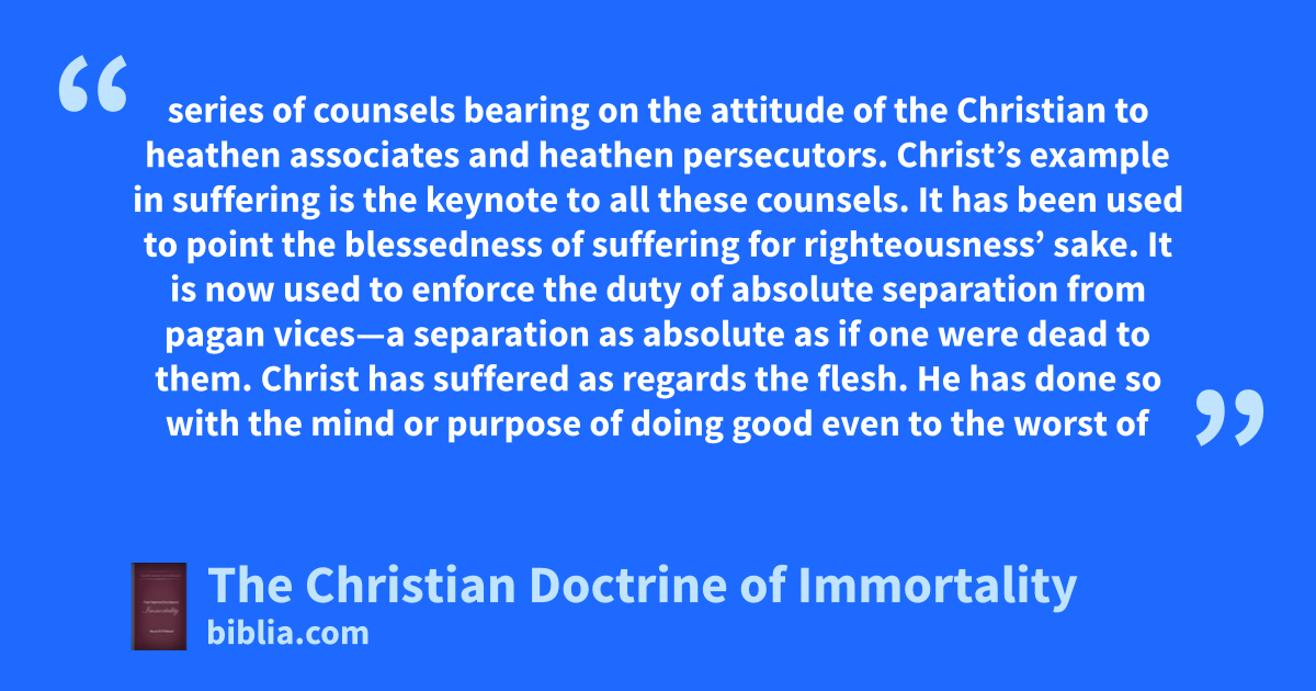 series of counsels bearing on the attitude of the Christian to heathen associates and heathen persecutors. Christ’s example in suffering is the keynote to all these counsels. It has been used to point the blessedness of suffering for righteousness’ sake. It is now used to enforce the duty of absolute separation from pagan vices—a separation as absolute as if one were dead to them. Christ has suffered as regards the flesh. He has done so with the mind or purpose of doing good even to the worst of