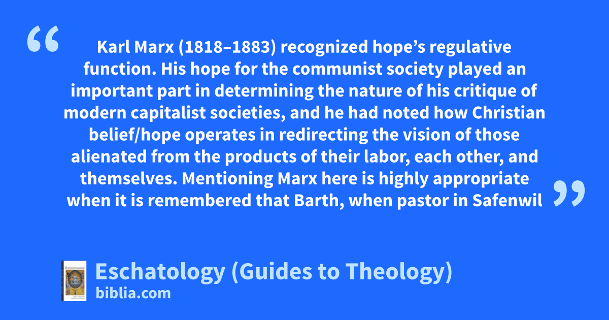 Karl Marx (1818–1883) recognized hope’s regulative function. His hope for the communist society played an important part in determining the nature of his critique of modern capitalist societies, and he had noted how Christian belief/hope operates in redirecting the vision of those alienated from the products of their labor, each other, and themselves. Mentioning Marx here is highly appropriate when it is remembered that Barth, when pastor in Safenwil
