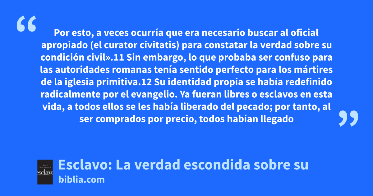 Por esto, a veces ocurría que era necesario buscar al oficial apropiado (el curator civitatis) para constatar la verdad sobre su condición civil».11 Sin embargo, lo que probaba ser confuso para las autoridades romanas tenía sentido perfecto para los mártires de la iglesia primitiva.12 Su identidad propia se había redefinido radicalmente por el evangelio. Ya fueran libres o esclavos en esta vida, a todos ellos se les había liberado del pecado; por tanto, al ser comprados por precio, todos habían llegado