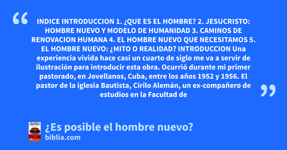 INDICE INTRODUCCION 1. ¿QUE ES EL HOMBRE? 2. JESUCRISTO: HOMBRE NUEVO Y MODELO DE HUMANIDAD 3. CAMINOS DE RENOVACION HUMANA 4. EL HOMBRE NUEVO QUE NECESITAMOS 5. EL HOMBRE NUEVO: ¿MITO O REALIDAD? INTRODUCCION Una experiencia vivida hace casi un cuarto de siglo me va a servir de ilustración para introducir esta obra. Ocurrió durante mi primer pastorado, en Jovellanos, Cuba, entre los años 1952 y 1956. El pastor de la iglesia Bautista, Cirilo Alemán, un ex-compañero de estudios en la Facultad de