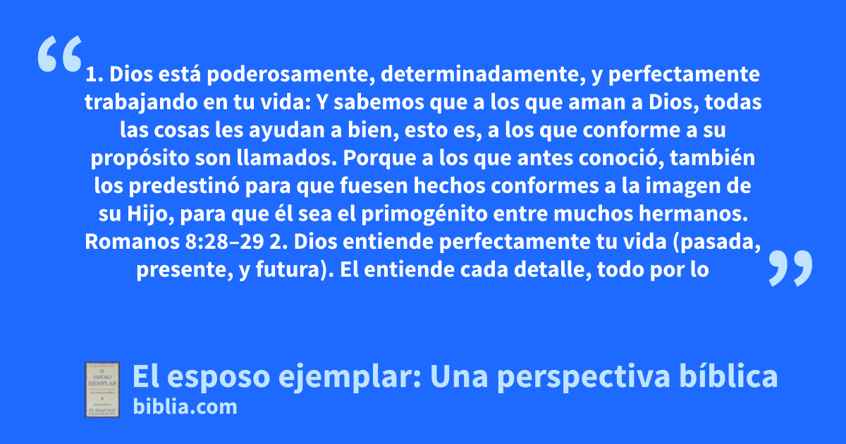 1. Dios está poderosamente, determinadamente, y perfectamente trabajando en tu vida: Y sabemos que a los que aman a Dios, todas las cosas les ayudan a bien, esto es, a los que conforme a su propósito son llamados. Porque a los que antes conoció, también los predestinó para que fuesen hechos conformes a la imagen de su Hijo, para que él sea el primogénito entre muchos hermanos. Romanos 8:28–29 2. Dios entiende perfectamente tu vida (pasada, presente, y futura). El entiende cada detalle, todo por lo