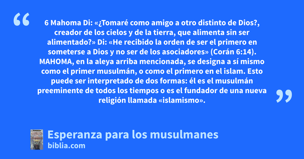 6 Mahoma Di: «¿Tomaré como amigo a otro distinto de Dios?, creador de los cielos y de la tierra, que alimenta sin ser alimentado?» Di: «He recibido la orden de ser el primero en someterse a Dios y no ser de los asociadores» (Corán 6:14). MAHOMA, en la aleya arriba mencionada, se designa a sí mismo como el primer musulmán, o como el primero en el islam. Esto puede ser interpretado de dos formas: él es el musulmán preeminente de todos los tiempos o es el fundador de una nueva religión llamada «islamismo».