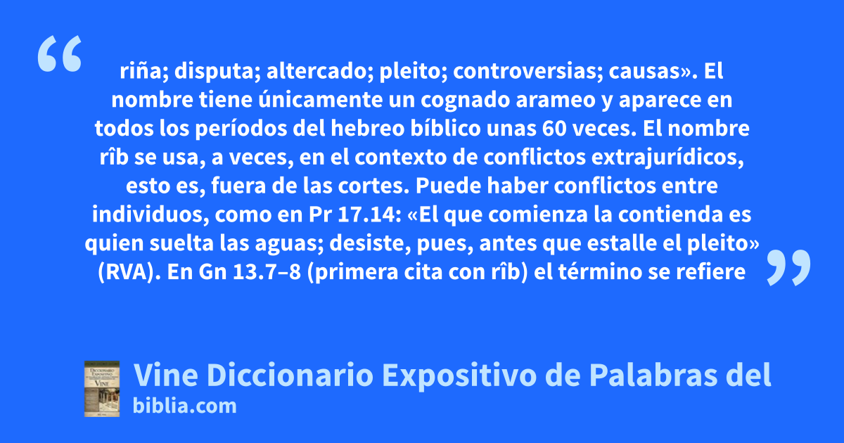 riña; disputa; altercado; pleito; controversias; causas». El nombre tiene únicamente un cognado arameo y aparece en todos los períodos del hebreo bíblico unas 60 veces. El nombre rîb se usa, a veces, en el contexto de conflictos extrajurídicos, esto es, fuera de las cortes. Puede haber conflictos entre individuos, como en Pr 17.14: «El que comienza la contienda es quien suelta las aguas; desiste, pues, antes que estalle el pleito» (RVA). En Gn 13.7–8 (primera cita con rîb) el término se refiere