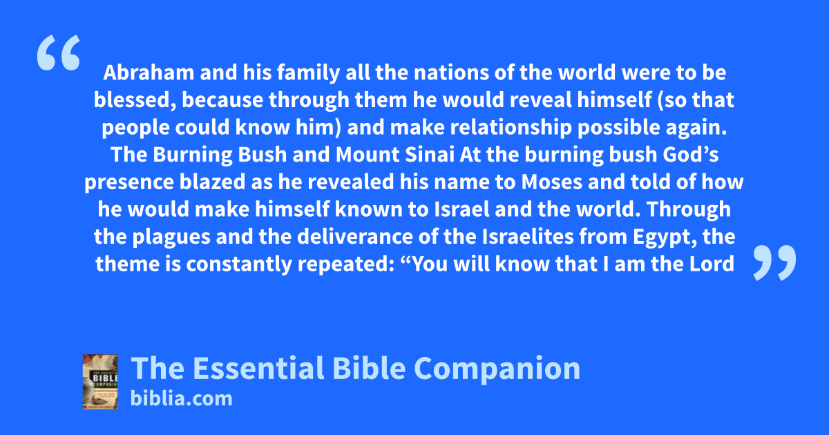 Abraham and his family all the nations of the world were to be blessed, because through them he would reveal himself (so that people could know him) and make relationship possible again. The Burning Bush and Mount Sinai At the burning bush God’s presence blazed as he revealed his name to Moses and told of how he would make himself known to Israel and the world. Through the plagues and the deliverance of the Israelites from Egypt, the theme is constantly repeated: “You will know that I am the Lord