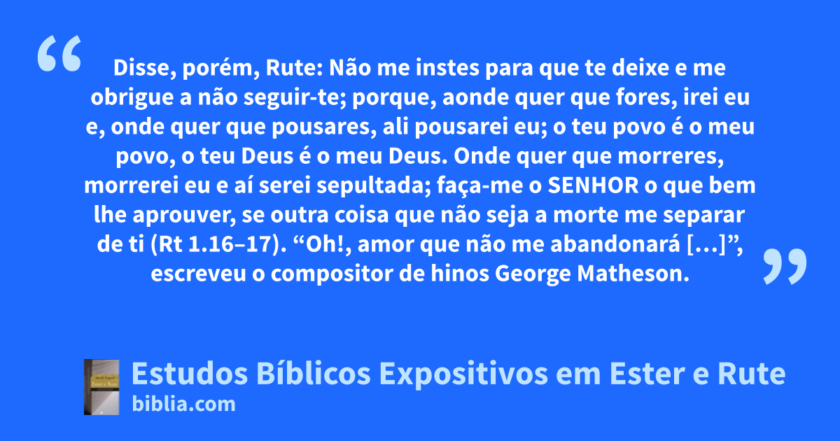 Disse, porém, Rute: Não me instes para que te deixe e me obrigue a não seguir-te; porque, aonde quer que fores, irei eu e, onde quer que pousares, ali pousarei eu; o teu povo é o meu povo, o teu Deus é o meu Deus. Onde quer que morreres, morrerei eu e aí serei sepultada; faça-me o SENHOR o que bem lhe aprouver, se outra coisa que não seja a morte me separar de ti (Rt 1.16–17). “Oh!, amor que não me abandonará […]”, escreveu o compositor de hinos George Matheson.