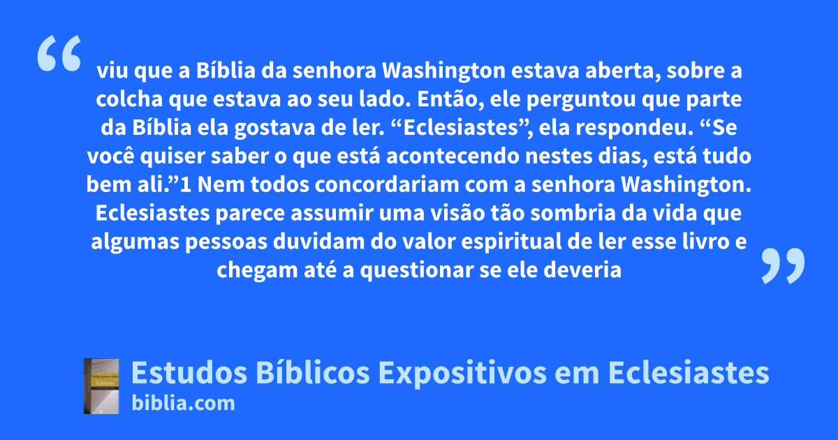 viu que a Bíblia da senhora Washington estava aberta, sobre a colcha que estava ao seu lado. Então, ele perguntou que parte da Bíblia ela gostava de ler. “Eclesiastes”, ela respondeu. “Se você quiser saber o que está acontecendo nestes dias, está tudo bem ali.”1 Nem todos concordariam com a senhora Washington. Eclesiastes parece assumir uma visão tão sombria da vida que algumas pessoas duvidam do valor espiritual de ler esse livro e chegam até a questionar se ele deveria
