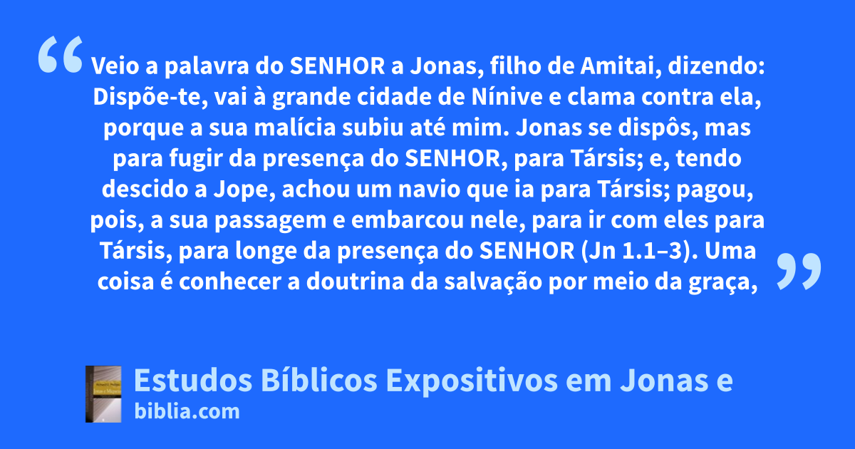 Veio a palavra do SENHOR a Jonas, filho de Amitai, dizendo: Dispõe-te, vai à grande cidade de Nínive e clama contra ela, porque a sua malícia subiu até mim. Jonas se dispôs, mas para fugir da presença do SENHOR, para Társis; e, tendo descido a Jope, achou um navio que ia para Társis; pagou, pois, a sua passagem e embarcou nele, para ir com eles para Társis, para longe da presença do SENHOR (Jn 1.1–3). Uma coisa é conhecer a doutrina da salvação por meio da graça,