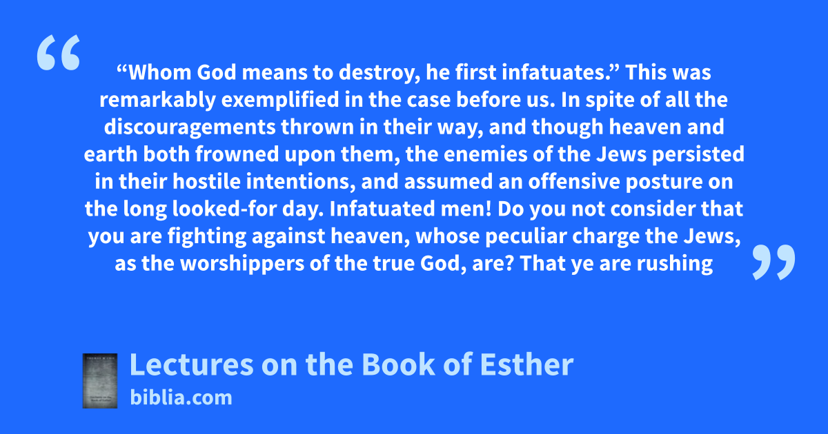 “Whom God means to destroy, he first infatuates.” This was remarkably exemplified in the case before us. In spite of all the discouragements thrown in their way, and though heaven and earth both frowned upon them, the enemies of the Jews persisted in their hostile intentions, and assumed an offensive posture on the long looked-for day. Infatuated men! Do you not consider that you are fighting against heaven, whose peculiar charge the Jews, as the worshippers of the true God, are? That ye are rushing