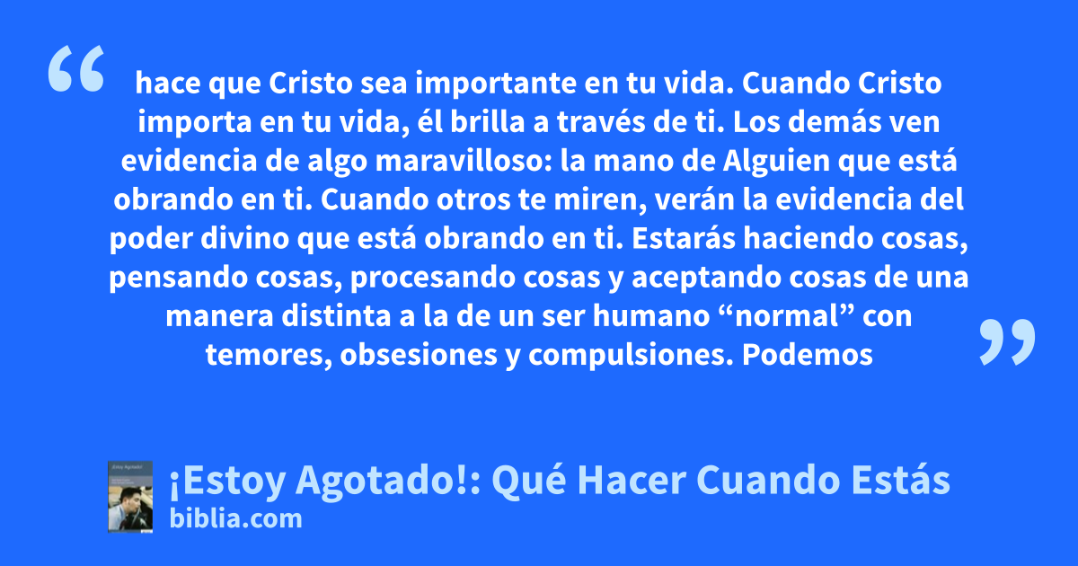 hace que Cristo sea importante en tu vida. Cuando Cristo importa en tu vida, él brilla a través de ti. Los demás ven evidencia de algo maravilloso: la mano de Alguien que está obrando en ti. Cuando otros te miren, verán la evidencia del poder divino que está obrando en ti. Estarás haciendo cosas, pensando cosas, procesando cosas y aceptando cosas de una manera distinta a la de un ser humano “normal” con temores, obsesiones y compulsiones. Podemos