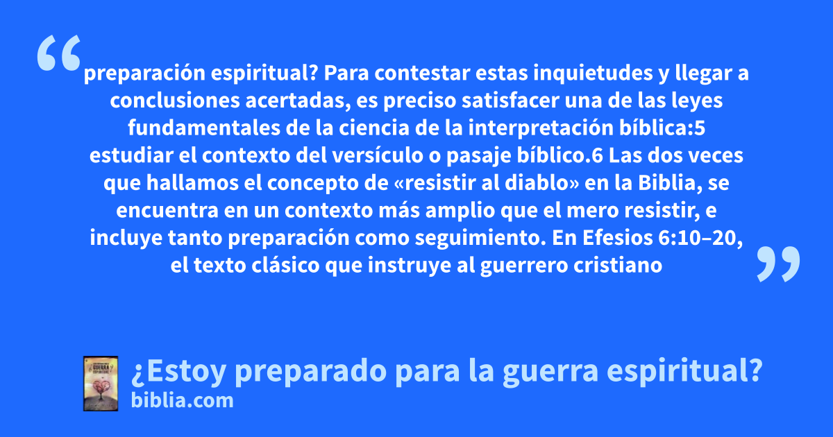 preparación espiritual? Para contestar estas inquietudes y llegar a conclusiones acertadas, es preciso satisfacer una de las leyes fundamentales de la ciencia de la interpretación bíblica:5 estudiar el contexto del versículo o pasaje bíblico.6 Las dos veces que hallamos el concepto de «resistir al diablo» en la Biblia, se encuentra en un contexto más amplio que el mero resistir, e incluye tanto preparación como seguimiento. En Efesios 6:10–20, el texto clásico que instruye al guerrero cristiano
