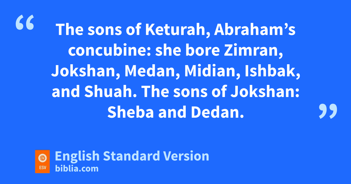 28 The sons of Abraham: iIsaac and jIshmael. 29 kThese are their genealogies: the firstborn of Ishmael, Nebaioth, and Kedar, Adbeel, Mibsam, 30 Mishma, Dumah, Massa, Hadad, Tema, 31 Jetur, Naphish, and Kedemah. These are the sons of Ishmael. 32 lThe sons of Keturah, Abraham’s concubine: she bore Zimran, Jokshan, Medan, Midian, Ishbak, and Shuah. The sons of Jokshan: Sheba and Dedan. 33 The sons of Midian: Ephah, Epher, Hanoch, Abida, and Eldaah. All these were the descendants of Keturah.