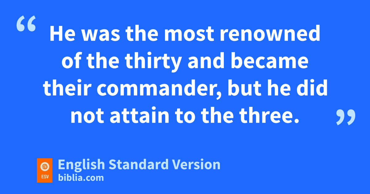 20 Now Abishai, the brother of Joab, was chief of the thirty.3 And he wielded his spear against 300 men and killed them and won a name beside the three. 21 He was the most renowned4 of the thirty5 and became their commander, but he did not attain to the three.