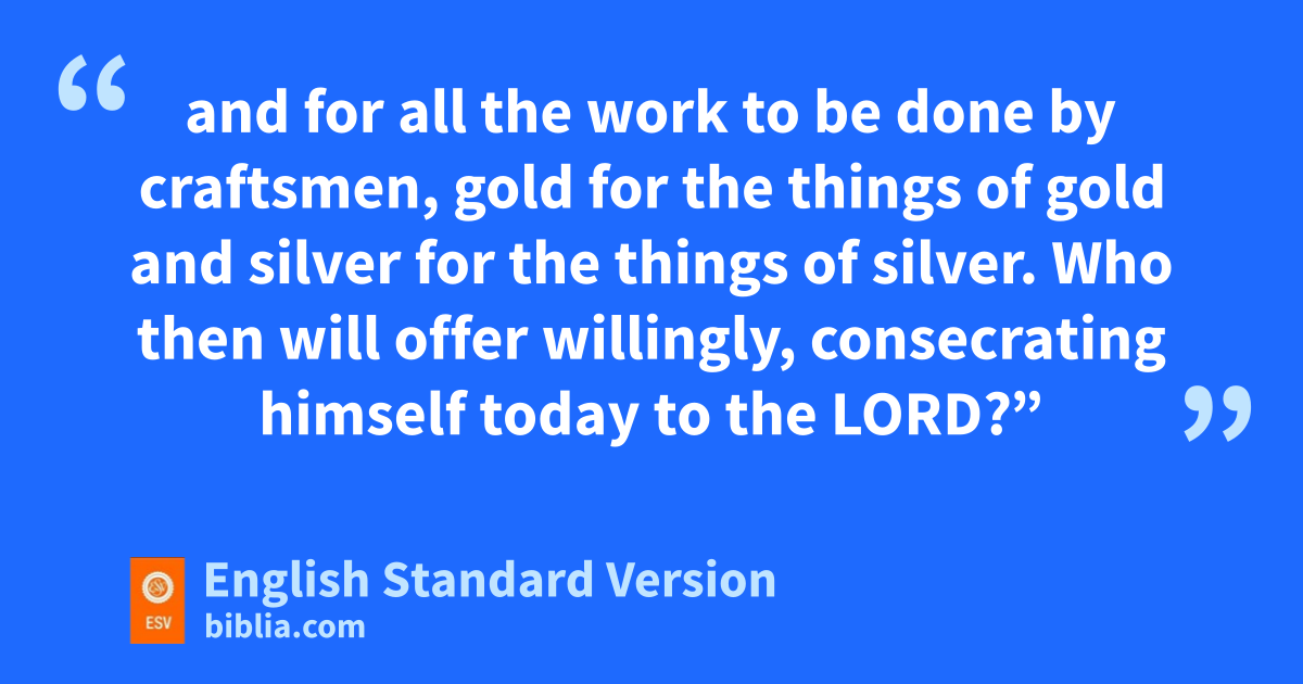 29 And David the king said to all the assembly, “Solomon my son, whom alone God has chosen, is pyoung and inexperienced, and the work is great, for qthe palace will not be for man but for the Lord God. 2 So I have provided for the house of my God, so far as I was able, the gold for the things of gold, the silver for the things of silver, and the bronze for the things of bronze, the iron for the things of iron, and wood for the things of wood, besides great quantities of ronyx and stones for setting, antimony, colored stones, all sorts of precious stones and marble. 3 Moreover, in addition to all that I have provided for the holy house, I have a treasure of my own of gold and silver, and because of my devotion to the house of my God I give it to the house of my God: 4 s3,000 talents1 of gold, of the gold of tOphir, and 7,000 talents of refined silver, for overlaying the walls of the house,2 5 and for all the work to be done by craftsmen, gold for the things of gold and silver for the things of silver. Who then will offer willingly, consecrating himself3 today to the Lord?”