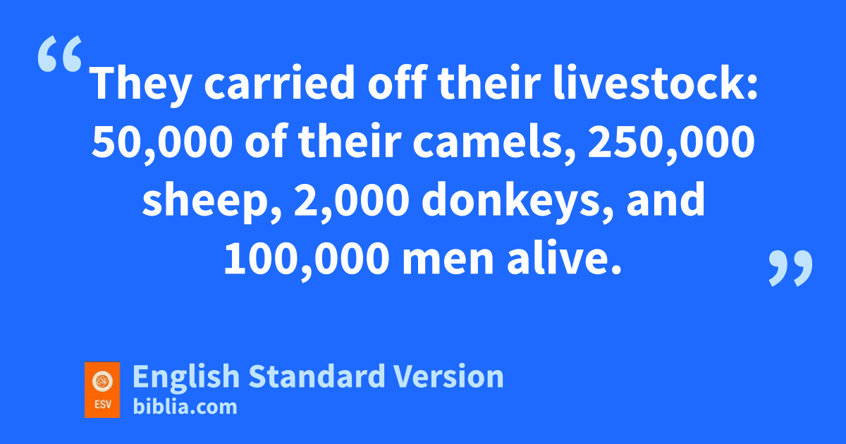 18 The Reubenites, the Gadites, and the half-tribe of Manasseh had valiant men who carried shield and sword, and drew the bow, uexpert in war, 44,760, able to go to war. 19 They waged war against the vHagrites, wJetur, Naphish, and Nodab. 20 And when they prevailed2 over them, the Hagrites and all who were with them were given into their hands, xfor they cried out to God in the battle, and he granted their urgent plea ybecause they trusted in him. 21 They carried off their livestock: 50,000 of their camels, 250,000 sheep, 2,000 donkeys, and 100,000 men alive. 22 For many fell, because the war was of God. And they lived zin their place until athe exile.