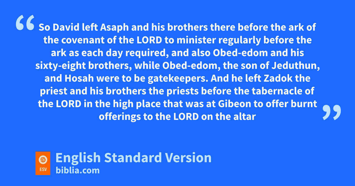 37 So David left Asaph and his brothers there fbefore the ark of the covenant of the Lord to minister regularly before the ark gas each day required, 38 and also hObed-edom and his3 sixty-eight brothers, while hObed-edom, the son of Jeduthun, and iHosah were to be gatekeepers. 39 And he left jZadok the priest and his brothers the priests before the tabernacle of the Lord kin the high place that was at Gibeon 40 to offer burnt offerings to the Lord lon the altar of burnt offering mregularly morning and evening, to do all that is written in the Law of the Lord that he commanded Israel. 41 With them were nHeman and Jeduthun oand the rest of those chosen and pexpressly named to give thanks to the Lord, qfor his steadfast love endures forever. 42 Heman and Jeduthun had trumpets and cymbals for the music and instruments rfor sacred song. The sons of Jeduthun were appointed to the gate.