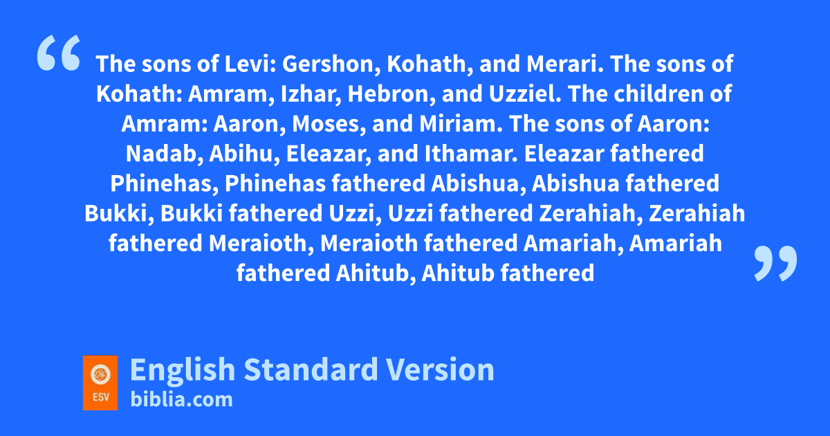 6 1 hThe sons of Levi: Gershon, Kohath, and Merari. 2 iThe sons of Kohath: Amram, Izhar, Hebron, and Uzziel. 3 jThe children of Amram: Aaron, Moses, and Miriam. kThe sons of Aaron: Nadab, Abihu, Eleazar, and Ithamar. 4 lmEleazar fathered nPhinehas, Phinehas fathered Abishua, 5 Abishua fathered Bukki, Bukki fathered Uzzi, 6 Uzzi fathered Zerahiah, Zerahiah fathered oMeraioth, 7 Meraioth fathered Amariah, Amariah fathered Ahitub, 8 pAhitub fathered qZadok, Zadok fathered Ahimaaz, 9 Ahimaaz fathered Azariah, Azariah fathered Johanan, 10 and Johanan fathered Azariah (rit was he who served as priest sin the house that Solomon built in Jerusalem). 11 lAzariah fathered tAmariah, Amariah fathered Ahitub, 12 Ahitub fathered Zadok, Zadok fathered uShallum, 13 Shallum fathered vHilkiah, Hilkiah fathered Azariah, 14 Azariah fathered wSeraiah, Seraiah fathered Jehozadak; 15 and xJehozadak went into exile when the Lord sent Judah and Jerusalem into exile yby the hand of Nebuchadnezzar.