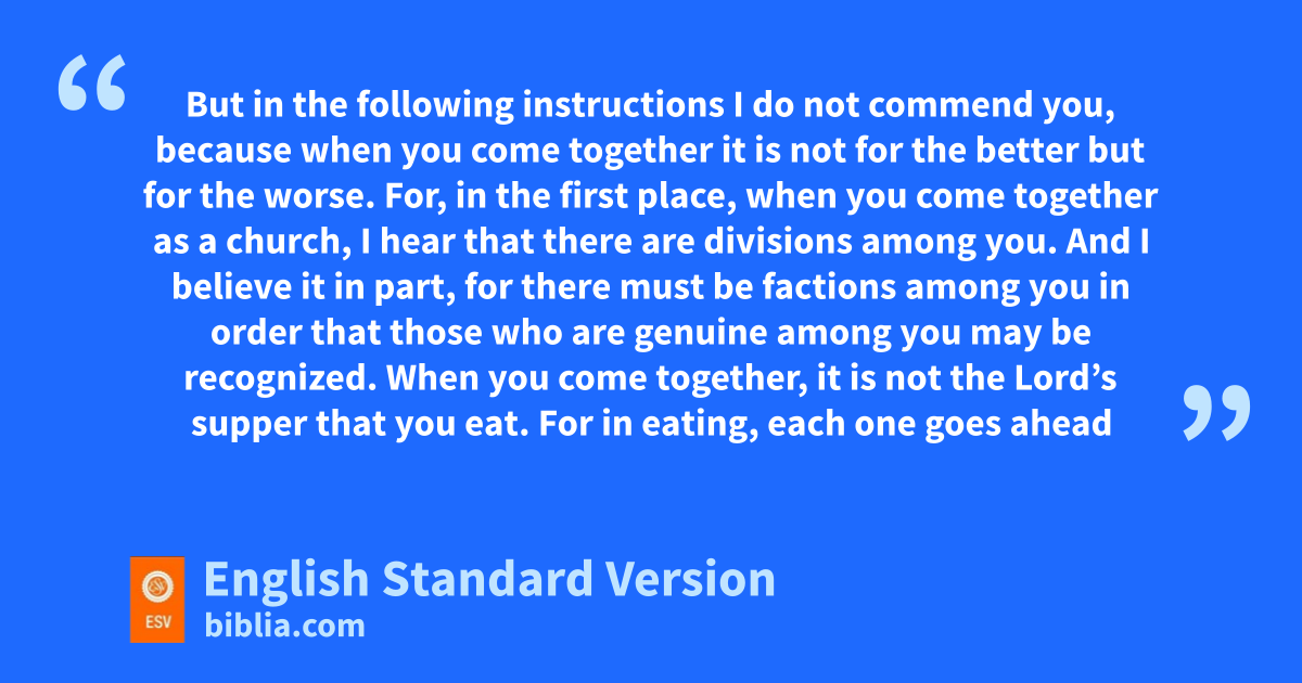17 But in the following instructions I do not commend you, because when you come together it is not for the better but for the worse. 18 For, in the first place, when you come together as a church, rI hear that there are divisions among you. And I believe it in part,5 19 for sthere must be factions among you in order tthat those who are genuine among you may be recognized. 20 When you come together, it is not the Lord’s supper that you eat. 21 For in eating, each one goes ahead with his own meal. One goes hungry, uanother gets drunk. 22 What! Do you not have houses to eat and drink in? Or do you despise vthe church of God and whumiliate those who have nothing? What shall I say to you? Shall I commend you in this? No, I will not.
