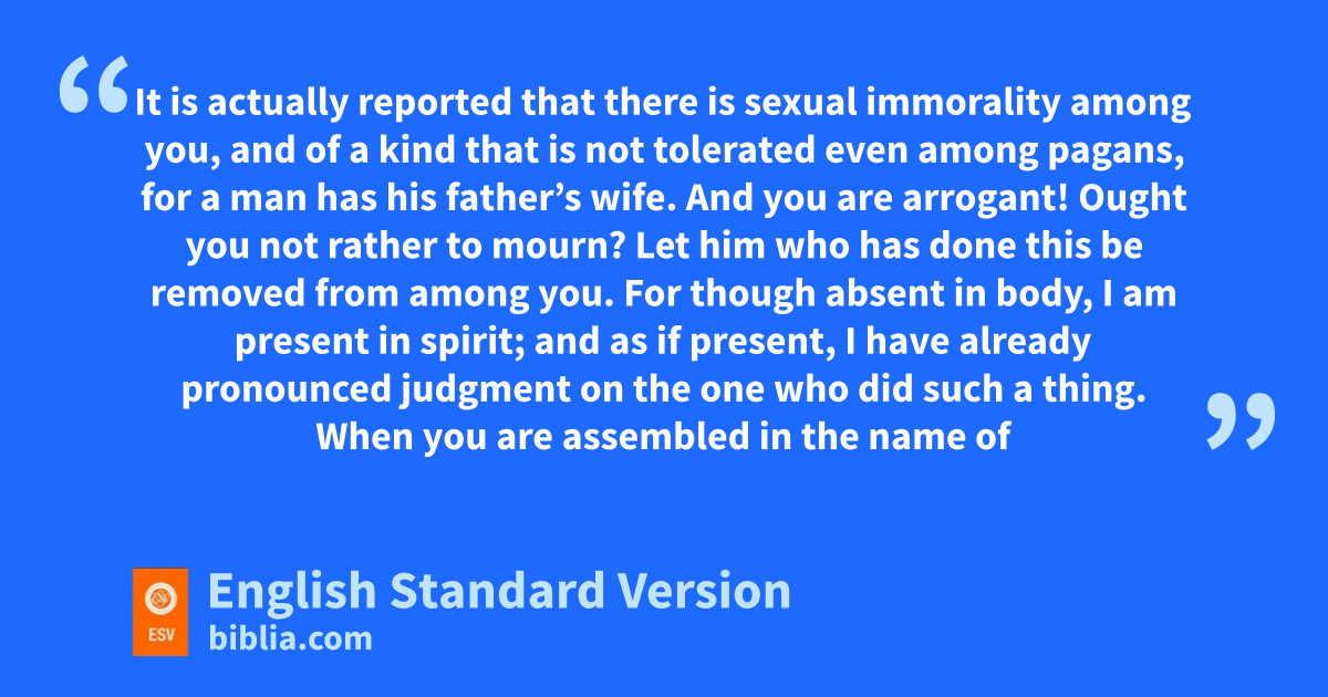 5 It is actually reported that there is wsexual immorality among you, and of a kind that is not tolerated even among pagans, xfor a man has his father’s wife. 2 And yyou are arrogant! Ought you znot rather to mourn? Let him who has done this be removed from among you.