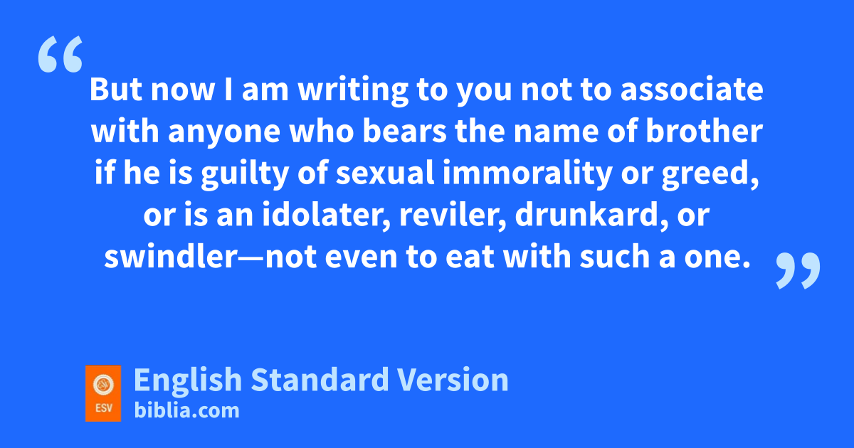 9 I wrote to you in my letter jnot to associate with sexually immoral people— 10 knot at all meaning lthe sexually immoral of this world, or the greedy and swindlers, or idolaters, msince then you would need to go out of the world. 11 But now I am writing to you not to associate with anyone nwho bears the name of brother if he is guilty of sexual immorality or greed, or is an idolater, reviler, drunkard, or swindler—not even to eat with such a one. 12 For what have I to do with judging ooutsiders? pIs it not those inside the church2 whom you are to judge? 13 God judges3 those outside. q“Purge the evil person from among you.”