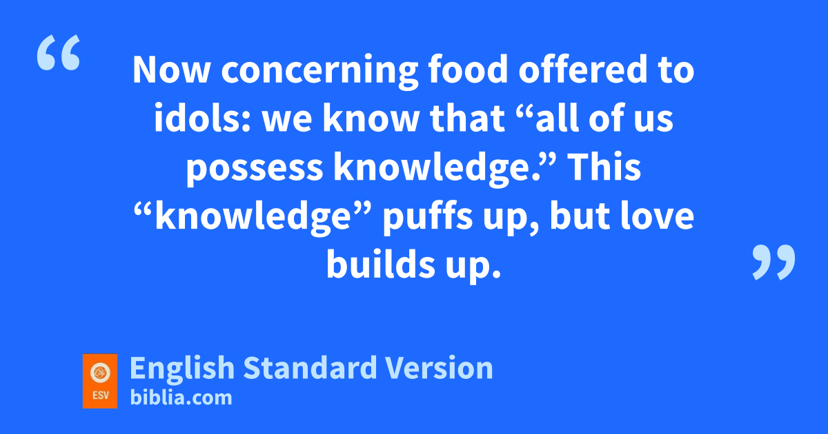 8 Now concerning1 mfood offered to idols: we know that n“all of us possess knowledge.” This “knowledge” opuffs up, pbut love builds up. 2 qIf anyone imagines that he knows something, rhe does not yet know as he ought to know. 3 But if anyone loves God, she is known by God.2