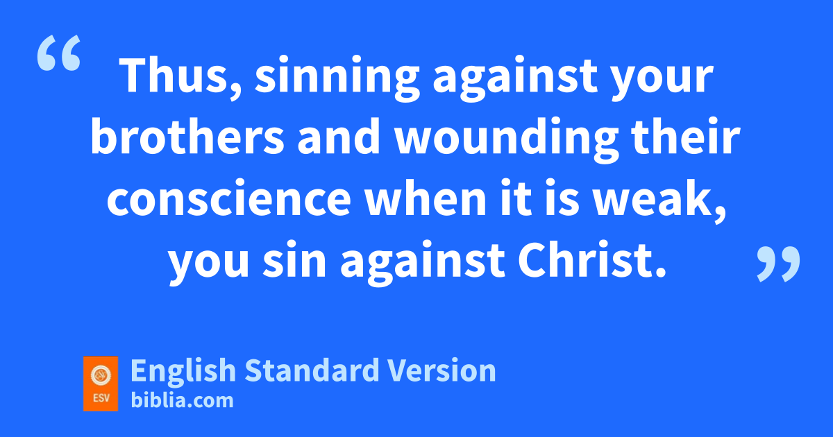 7 However, not all possess this knowledge. But some, athrough former association with idols, eat food as really offered to an idol, and btheir conscience, being weak, is defiled. 8 cFood will not commend us to God. We are no worse off if we do not eat, and no better off if we do. 9 But take care dthat this right of yours does not somehow become a stumbling block eto the weak. 10 For if anyone sees you who have knowledge eating3 in an idol’s temple, will he not be encouraged,4 if his conscience is weak, to eat food offered to idols? 11 And so by your knowledge this weak person is fdestroyed, the brother for whom Christ died. 12 Thus, sinning against your brothers5 and gwounding their conscience when it is weak, hyou sin against Christ. 13 Therefore, iif food makes my brother stumble, I will never eat meat, lest I make my brother stumble.