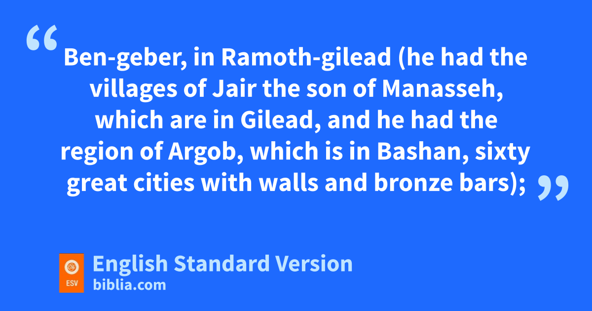 7 Solomon had twelve officers over all Israel, who provided food for the king and his household. Each man had to make provision for one month in the year. 8 These were their names: Ben-hur, in jthe hill country of Ephraim; 9 Ben-deker, in Makaz, Shaalbim, Beth-shemesh, and Elonbeth-hanan; 10 Ben-hesed, in Arubboth (to him belonged Socoh and all the land of Hepher); 11 Ben-abinadab, in all kNaphath-dor (he had Taphath the daughter of Solomon as his wife); 12 Baana the son of Ahilud, in lTaanach, Megiddo, and all lBeth-shean that is beside Zarethan below Jezreel, and from Beth-shean to Abel-meholah, as far as the other side of Jokmeam; 13 Ben-geber, min Ramoth-gilead (he had nthe villages of Jair the son of Manasseh, which are in Gilead, and he had othe region of Argob, which is in Bashan, sixty great cities with walls and bronze bars); 14 Ahinadab the son of Iddo, in Mahanaim; 15 Ahimaaz, in Naphtali (he had taken Basemath the daughter of Solomon as his wife); 16 Baana the son of Hushai, in Asher and Bealoth; 17 Jehoshaphat the son of Paruah, in Issachar; 18 pShimei the son of Ela, in Benjamin; 19 Geber the son of Uri, in the land of Gilead, qthe country of Sihon king of the Amorites and of Og king of Bashan. And there was one governor who was over the land.