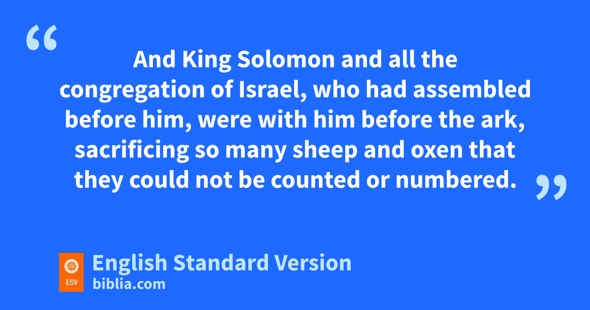 8 jThen Solomon assembled the elders of Israel and all the heads of the tribes, kthe leaders of the fathers’ houses of the people of Israel, before King Solomon in Jerusalem, lto bring up the ark of the covenant of the Lord out of mthe city of David, which is Zion. 2 And all the men of Israel assembled to King Solomon at nthe feast in the month Ethanim, which is the seventh month. 3 And all the elders of Israel came, and othe priests took up the ark. 4 And they brought up the ark of the Lord, pthe tent of meeting, and all the holy vessels that were in the tent; the priests and the Levites brought them up. 5 And King Solomon and all the congregation of Israel, who had assembled before him, were with him before the ark, qsacrificing so many sheep and oxen that they could not be counted or numbered. 6 rThen the priests brought the ark of the covenant of the Lord sto its place in tthe inner sanctuary of the house, in the Most Holy Place, underneath the wings of the cherubim. 7 For the cherubim spread out their wings over the place of the ark, so that the cherubim overshadowed the ark and its poles. 8 uAnd the poles were so long that the ends of the poles were seen from the Holy Place before tthe inner sanctuary; but they could not be seen from outside. And they are there to this day. 9 There was nothing in the ark except vthe two tablets of stone that Moses put there at Horeb, where wthe Lord made a covenant with the people of Israel, when they came out of the land of Egypt. 10 And when the priests came out of the Holy Place, xa cloud filled the house of the Lord, 11 so that the priests could not stand to minister because of the cloud, for the glory of the Lord filled the house of the Lord.