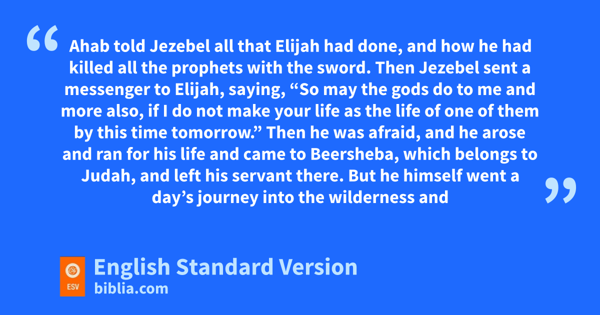 19 Ahab told Jezebel all that Elijah had done, and how qhe had killed all the prophets with the sword. 2 Then Jezebel sent a messenger to Elijah, saying, r“So may the gods do to me and more also, if I do not make your life as the life of one of them by this time tomorrow.” 3 Then he was afraid, and he arose and ran for his life and came to sBeersheba, which belongs to Judah, and left his servant there.