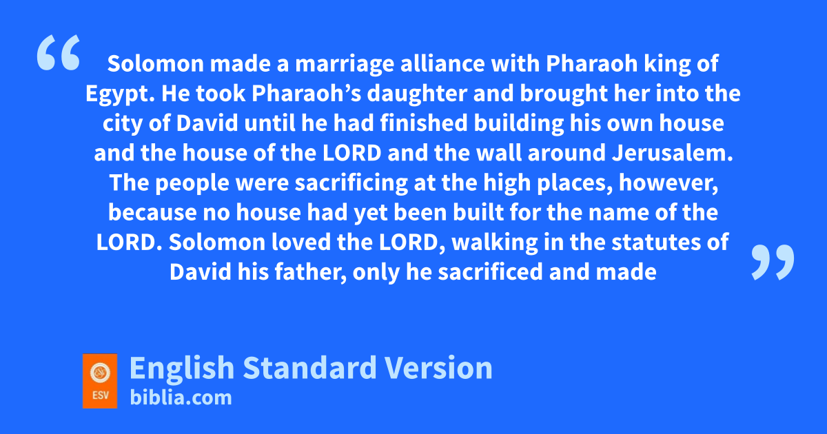 3 vSolomon made a marriage alliance with Pharaoh king of Egypt. He took Pharaoh’s daughter and brought her into wthe city of David until he had finished xbuilding his own house yand the house of the Lord zand the wall around Jerusalem. 2 aThe people were sacrificing at the high places, however, because no house had yet been built for the name of the Lord.