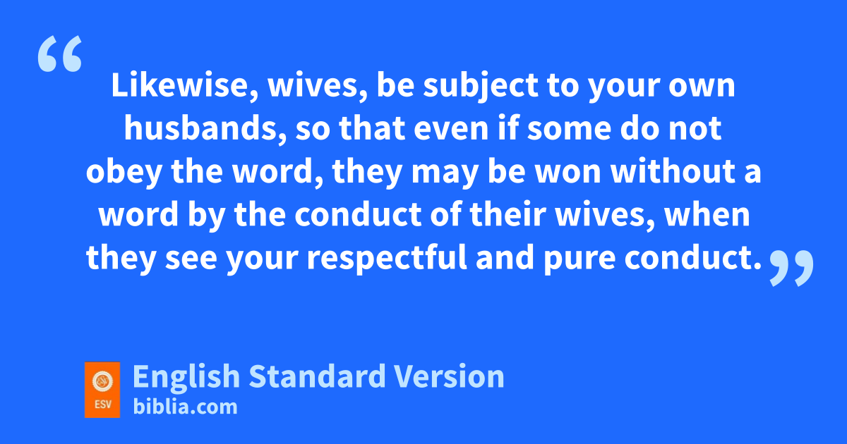 3 Likewise, wives, kbe subject to your own husbands, so that leven if some do not obey the word, mthey may be won without a word by the conduct of their wives, 2 when they see your nrespectful and pure conduct. 3 oDo not let your adorning be external—the braiding of hair and the putting on of gold jewelry, or the clothing you wear— 4 but let your adorning be pthe hidden person of the heart with the imperishable beauty of a gentle and quiet spirit, which in God’s sight is very precious. 5 For this is how the holy women who hoped in God used to adorn themselves, by submitting to their own husbands, 6 as Sarah obeyed Abraham, qcalling him lord. And you are her children, if you do good and rdo not fear anything that is frightening.