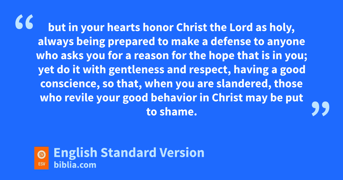 13 Now cwho is there to harm you if you are zealous for what is good? 14 dBut even if you should suffer for righteousness’ sake, you will be blessed. eHave no fear of them, fnor be troubled, 15 but gin your hearts honor Christ the Lord as holy, halways being prepared to make a defense to anyone who asks you for a reason for the hope that is in you; yet do it with gentleness and irespect, 16 jhaving a good conscience, so that, kwhen you are slandered, those who revile your good behavior in Christ may be put to shame. 17 For lit is better to suffer for doing good, if that should be God’s will, than for doing evil.