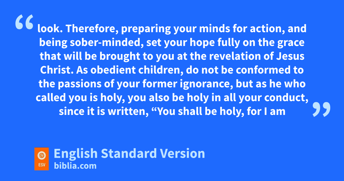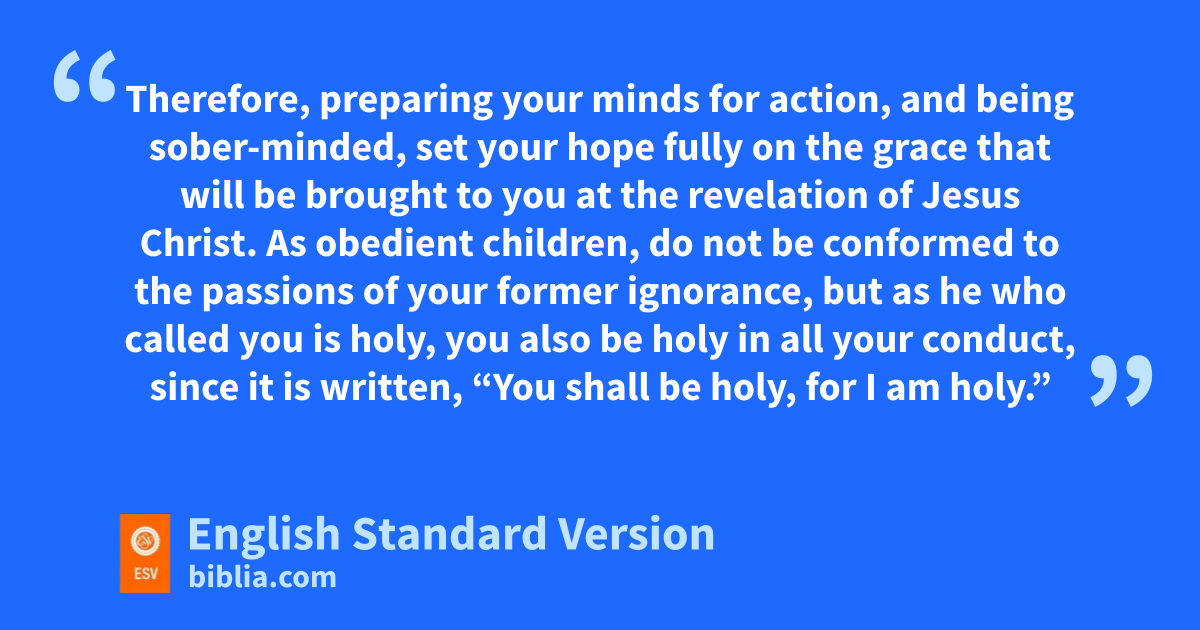 13 Therefore, gpreparing your minds for action,2 and hbeing sober-minded, set your hope fully on the grace that will be brought to you at the revelation of Jesus Christ. 14 As obedient children, ido not be conformed to the passions jof your former ignorance, 15 but kas he who called you is holy, you also be holy lin all your conduct, 16 since it is written, m“You shall be holy, for I am holy.” 17 And if you ncall on him as Father who ojudges pimpartially according to each one’s deeds, conduct yourselves qwith fear throughout the time of your exile, 18 knowing that you rwere ransomed from sthe futile ways inherited from your forefathers, not with perishable things such as silver or gold, 19 but twith the precious blood of Christ, like that of ua lamb vwithout blemish or spot. 20 He was foreknown before the foundation of the world but wwas made manifest xin the last times for the sake of you 21 ywho through him are believers in God, zwho raised him from the dead and agave him glory, so that your faith and hope are in God.