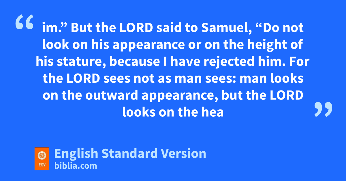 6 When they came, he looked on aEliab and thought, “Surely the Lord’s anointed is before him.” 7 But the Lord said to Samuel, b“Do not look on his appearance or on the height of his stature, because I have rejected him. For the Lord sees not as man sees: man looks on the outward appearance, cbut the Lord looks on the heart.” 8 Then Jesse called dAbinadab and made him pass before Samuel. And he said, “Neither has the Lord chosen this one.” 9 Then Jesse made dShammah pass by. And he said, “Neither has the Lord chosen this one.” 10 And Jesse made seven of his sons pass before Samuel. And Samuel said to Jesse, “The Lord has not chosen these.” 11 Then Samuel said to Jesse, “Are all your sons here?” And he said, e“There remains yet the youngest,1 but behold, he is keeping the sheep.” And Samuel said to Jesse, f“Send and get him, for we will not sit down till he comes here.” 12 And he sent and brought him in. Now he was gruddy and had beautiful eyes and was handsome. And the Lord said, h“Arise, anoint him, for this is he.” 13 Then Samuel took ithe horn of oil jand anointed him in the midst of his brothers. kAnd the Spirit of the Lord rushed upon David from that day forward. And Samuel rose up and went to Ramah.