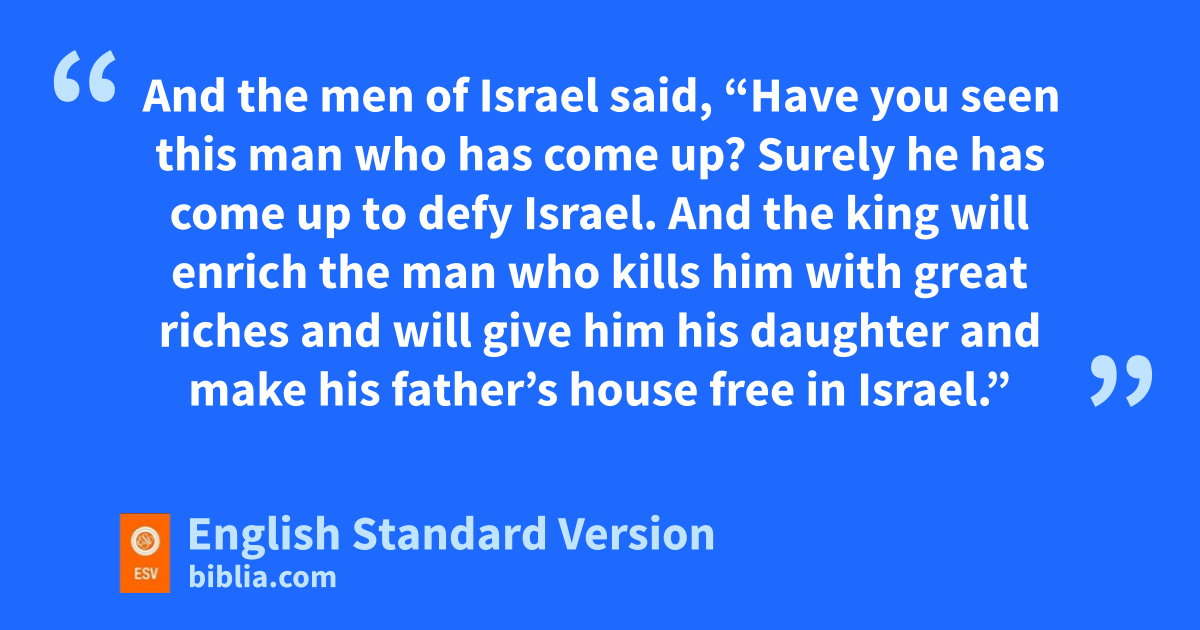 24 All the men of Israel, when they saw the man, fled from him and were much afraid. 25 And the men of Israel said, “Have you seen this man who has come up? Surely he has come up to udefy Israel. And the king will enrich the man who kills him with great riches vand will give him his daughter and make his father’s house free in Israel.” 26 And David said to the men who stood by him, “What shall be done for the man who kills this Philistine and takes away wthe reproach from Israel? For who is this xuncircumcised Philistine, that he should udefy the armies of ythe living God?” 27 And the people answered him in the same way, z“So shall it be done to the man who kills him.”