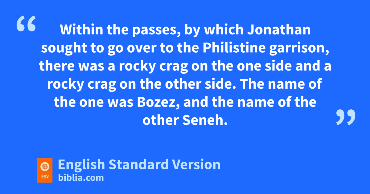 14 One day Jonathan the son of Saul said to the young man who carried his armor, “Come, let us go over to the Philistine garrison on the other side.” But he did not tell his father. 2 Saul was staying in the outskirts of Gibeah in the pomegranate cave1 at hMigron. The people who were with him were about isix hundred men, 3 including jAhijah the son of Ahitub, kIchabod’s brother, son of Phinehas, son of Eli, the priest of the Lord lin Shiloh, mwearing an ephod. And the people did not know that Jonathan had gone. 4 Within nthe passes, by which Jonathan sought to go over to the Philistine garrison, there was a rocky crag on the one side and a rocky crag on the other side. The name of the one was Bozez, and the name of the other Seneh. 5 The one crag rose on the north in front of Michmash, and the other on the south in front of oGeba.