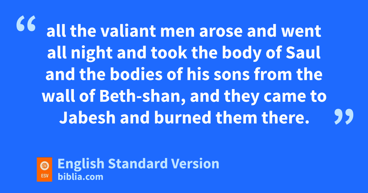 8 The next day, when the Philistines came to strip the slain, they found Saul and his three sons fallen on Mount Gilboa. 9 So they cut off his head and stripped off his armor and sent messengers throughout the land of the Philistines, dto carry the good news eto the house of their idols and to the people. 10 fThey put his armor in the temple of gAshtaroth, and they fastened his body to the wall of hBeth-shan. 11 iBut when the inhabitants of Jabesh-gilead heard what the Philistines had done to Saul, 12 jall the valiant men arose and went all night and took the body of Saul and the bodies of his sons from the wall of Beth-shan, and they came to Jabesh kand burned them there. 13 And they took their bones land buried them under mthe tamarisk tree in Jabesh and nfasted seven days.
