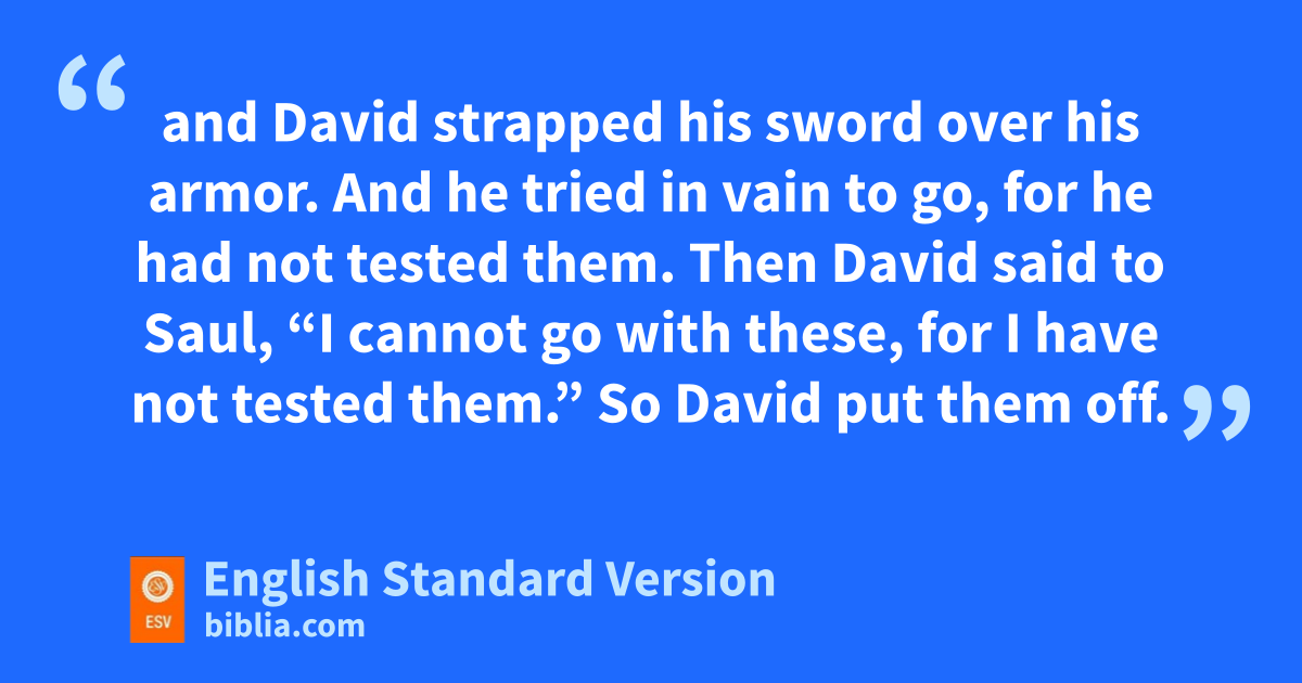 38 Then Saul clothed David with his armor. He put a helmet of bronze on his head and clothed him with a coat of mail, 39 and David strapped his sword over his armor. And he tried in vain to go, for he had not tested them. Then David said to Saul, “I cannot go with these, for I have not tested them.” So David put them off. 40 Then he took his staff in his hand and chose five smooth stones from the brook and put them in his shepherd’s pouch. His sling was in his hand, and he approached the Philistine.