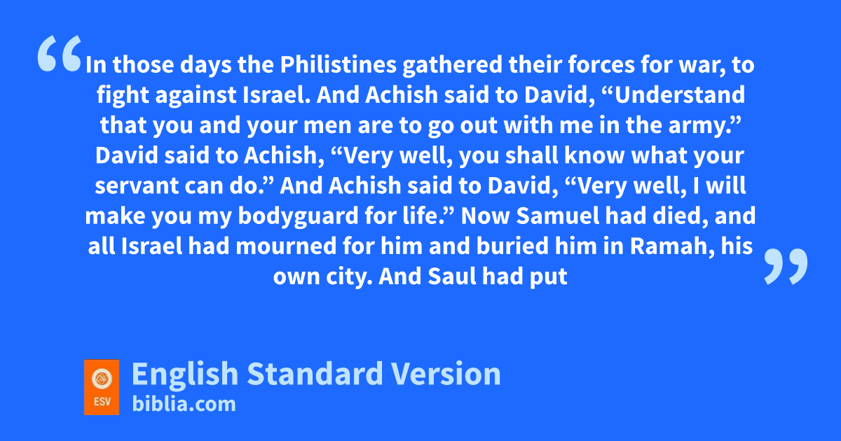28 In those days ithe Philistines gathered their forces for war, to fight against Israel. And Achish said to David, “Understand that you and your men are to go out with me in the army.” 2 David said to Achish, “Very well, you shall know what your servant can do.” And Achish said to David, “Very well, I will make you my bodyguard for life.”