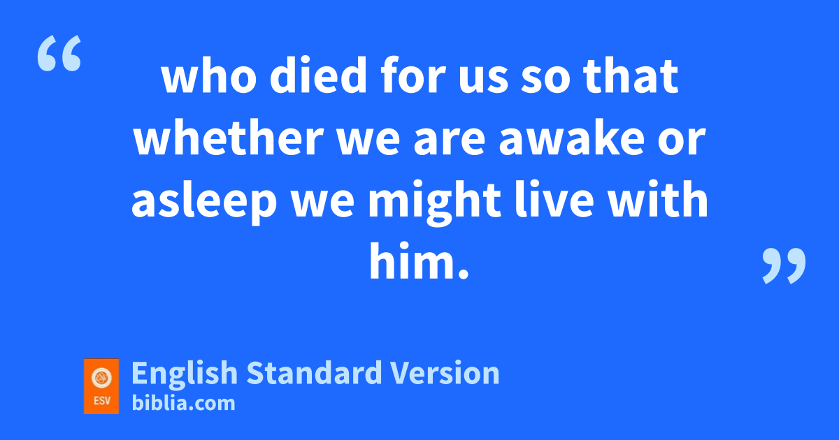 5 Now concerning wthe times and the seasons, brothers,1 xyou have no need to have anything written to you. 2 For you yourselves are fully aware that ythe day of the Lord will come like a thief in the night. 3 While people are saying, “There is peace and security,” then zsudden destruction will come upon them aas labor pains come upon a pregnant woman, and they will not escape. 4 But you bare not in darkness, brothers, for that day to surprise you like a thief. 5 For you are all cchildren2 of light, children of the day. We are not of the night or of the darkness. 6 So then dlet us not sleep, as others do, but let us ekeep awake and fbe sober. 7 For those who sleep, sleep at night, and those who get drunk, gare drunk at night. 8 But since we belong to the day, let us be sober, hhaving put on the breastplate of ifaith and love, and for a helmet the hope of salvation. 9 For God has not destined us for jwrath, but kto obtain salvation through our Lord Jesus Christ, 10 lwho died for us so that whether we are awake or asleep we might live with him. 11 Therefore encourage one another and build one another up, just as you are doing.