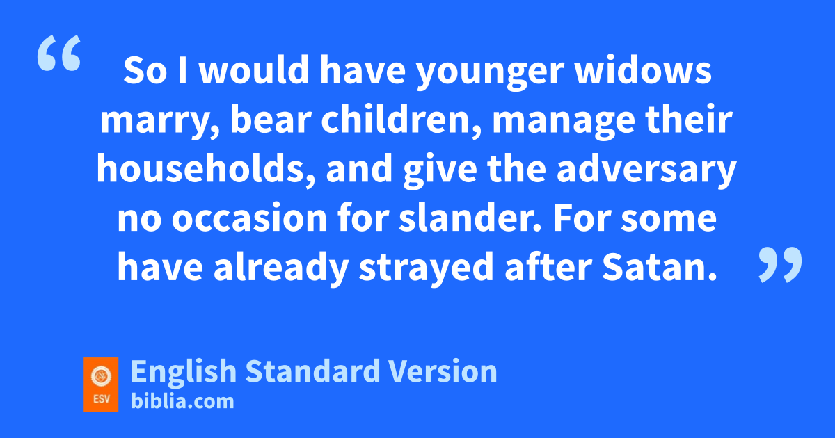 9 Let a widow be enrolled if she is not less than sixty years of age, having been nthe wife of one husband,1 10 and having a reputation for good works: if she has brought up children, has nshown hospitality, ohas washed the feet of the saints, has pcared for the afflicted, and has qdevoted herself to every good work. 11 But refuse to enroll younger widows, for when rtheir passions draw them away from Christ, they desire to marry 12 and so incur condemnation for having abandoned their former faith. 13 Besides that, they learn to be idlers, going about from house to house, and not only idlers, but also sgossips and tbusybodies, saying what they should not. 14 So I would have uyounger widows marry, bear children, vmanage their households, and wgive the adversary no occasion for slander. 15 xFor some have already strayed after Satan. 16 If any believing woman has relatives who are widows, let her care for them. Let the church not be burdened, so that it may care for those ywho are truly widows.