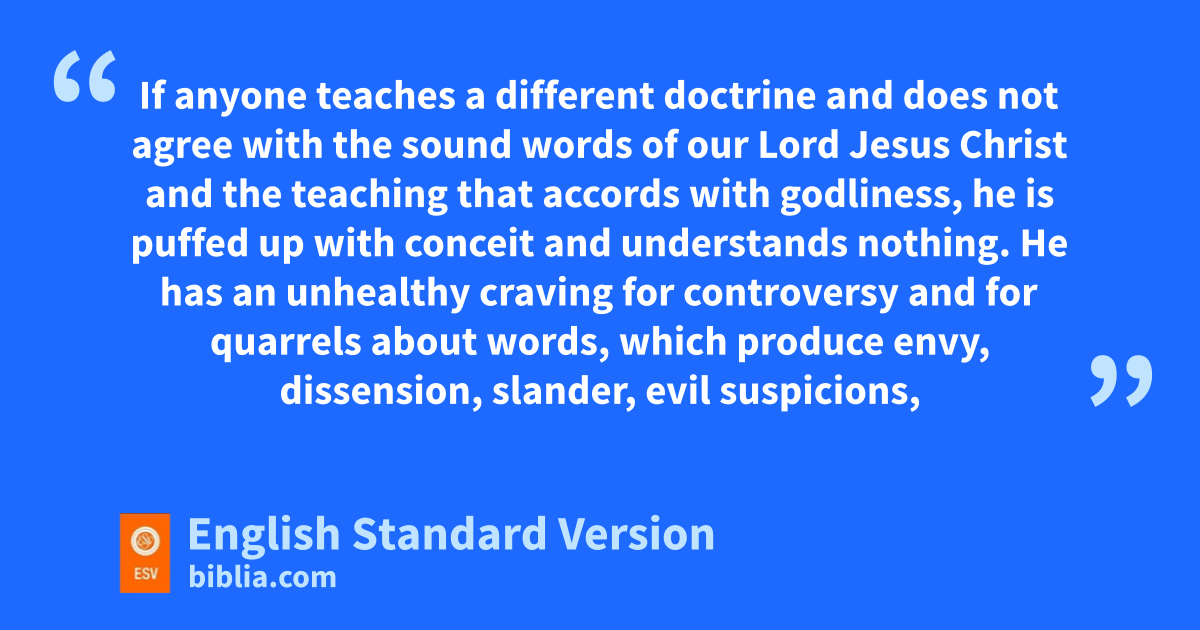 rTeach and urge these things. 3 If anyone steaches a different doctrine and does not agree with tthe sound2 words of our Lord Jesus Christ and the teaching uthat accords with godliness, 4 vhe is puffed up with conceit and wunderstands nothing. He has an unhealthy craving for xcontroversy and for yquarrels about words, which produce envy, dissension, slander, evil suspicions, 5 and constant friction among people zwho are depraved in mind and deprived of the truth, aimagining that godliness is a means of gain. 6 But bgodliness cwith contentment is great gain, 7 for dwe brought nothing into the world, and3 we cannot take anything out of the world. 8 But eif we have food and clothing, with these we will be content. 9 But fthose who desire to be rich fall into temptation, ginto a snare, into many senseless and harmful desires that hplunge people into ruin and destruction. 10 For the love of money is a root of iall kinds of evils. It is through this craving that some have wandered away from the faith and pierced themselves with many pangs.