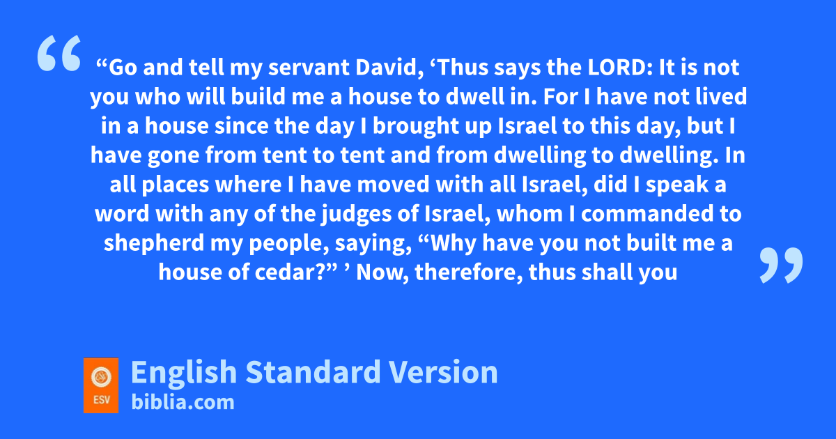 3 But that same night the word of the Lord came to Nathan, 4 “Go and tell my servant David, ‘Thus says the Lord: uIt is not you who will build me a house to dwell in. 5 For I have not lived in a house since the day I brought up Israel to this day, vbut I have gone from tent to tent and from dwelling to dwelling. 6 In all places where I have moved with all Israel, did I speak a word with any of the judges of Israel, whom I commanded to shepherd my people, saying, “Why have you not built me a house of cedar?” ’ 7 Now, therefore, thus shall you say to my servant David, ‘Thus says the Lord of hosts, I took you from the pasture, from following the sheep, to be prince over my people Israel, 8 and I have been with you wherever you have gone and have cut off all your enemies from before you. And I will make for you a name, like the name of the great ones of the earth. 9 And I will appoint a place for my people Israel and will plant them, that they may dwell in their own place and be disturbed no more. And violent men shall waste them no more, as formerly, 10 from the time that I appointed judges over my people Israel. And I wwill subdue all your enemies. Moreover, I declare to you that the Lord will build you a house. 11 When your days are fulfilled to walk with your fathers, I will raise up your offspring after you, one of your own sons, and I will establish his kingdom. 12 He shall build a house for me, and I will establish his throne forever. 13 xI will be to him a father, and he shall be to me a son. I will not take my steadfast love from him, yas I took it from him who was before you, 14 but I will confirm him in my house and in my kingdom forever, and his throne shall be established forever.’ ” 15 In accordance with all these words, and in accordance with all this vision, Nathan spoke to David.