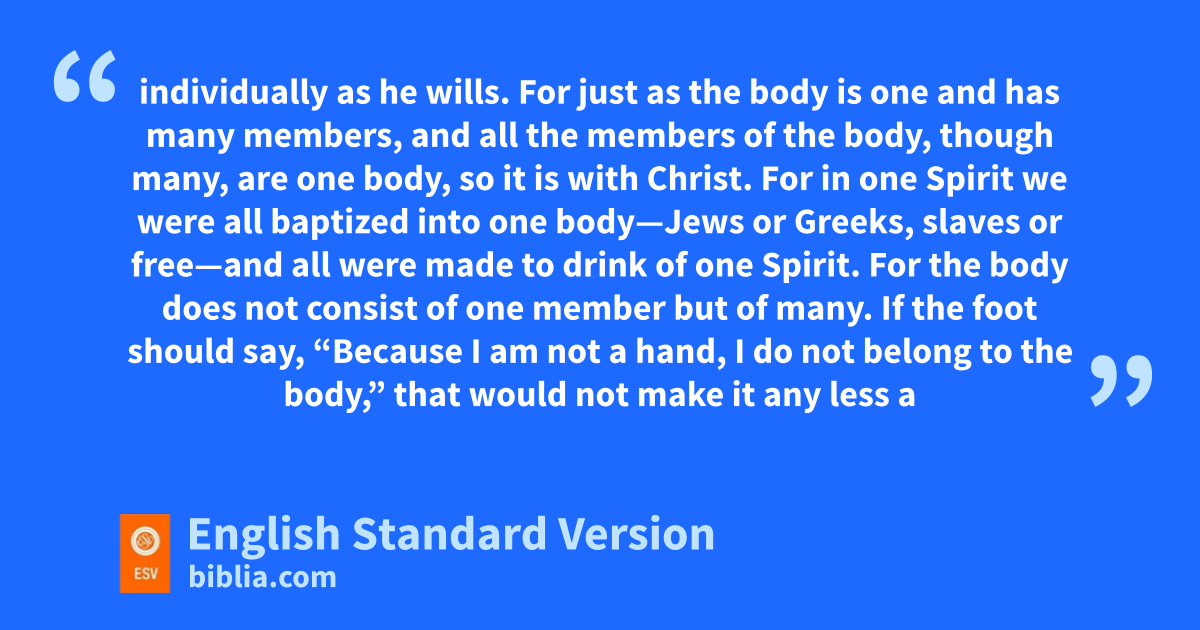 14 For the body does not consist of one member but of many. 15 If the foot should say, “Because I am not a hand, I do not belong to the body,” that would not make it any less a part of the body. 16 And if the ear should say, “Because I am not an eye, I do not belong to the body,” that would not make it any less a part of the body. 17 If the whole body were an eye, where would be the sense of hearing? If the whole body were an ear, where would be the sense of smell? 18 But as it is, nGod arranged the members in the body, each one of them, oas he chose. 19 If all were a single member, where would the body be? 20 As it is, there are many parts,5 yet one body.