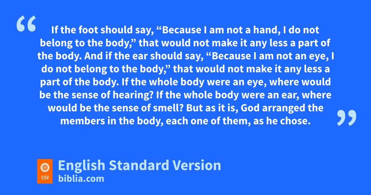 14 For the body does not consist of one member but of many. 15 If the foot should say, “Because I am not a hand, I do not belong to the body,” that would not make it any less a part of the body. 16 And if the ear should say, “Because I am not an eye, I do not belong to the body,” that would not make it any less a part of the body. 17 If the whole body were an eye, where would be the sense of hearing? If the whole body were an ear, where would be the sense of smell? 18 But as it is, nGod arranged the members in the body, each one of them, oas he chose. 19 If all were a single member, where would the body be? 20 As it is, there are many parts,5 yet one body.