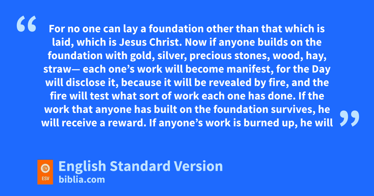 10 rAccording to the grace of God given to me, like a skilled2 master builder I laid a sfoundation, and tsomeone else is building upon it. Let each one take care how he builds upon it. 11 For no one can lay a ufoundation other vthan that which is laid, wwhich is Jesus Christ. 12 Now if anyone builds on the foundation with gold, silver, precious stones, wood, hay, straw— 13 xeach one’s work will become manifest, for the Day will disclose it, because it will be revealed yby fire, and zthe fire will test what sort of work each one has done. 14 If the work that anyone has built on the foundation survives, ahe will receive a reward. 15 If anyone’s work is burned up, he will suffer loss, though he himself will be saved, bbut only as through fire.