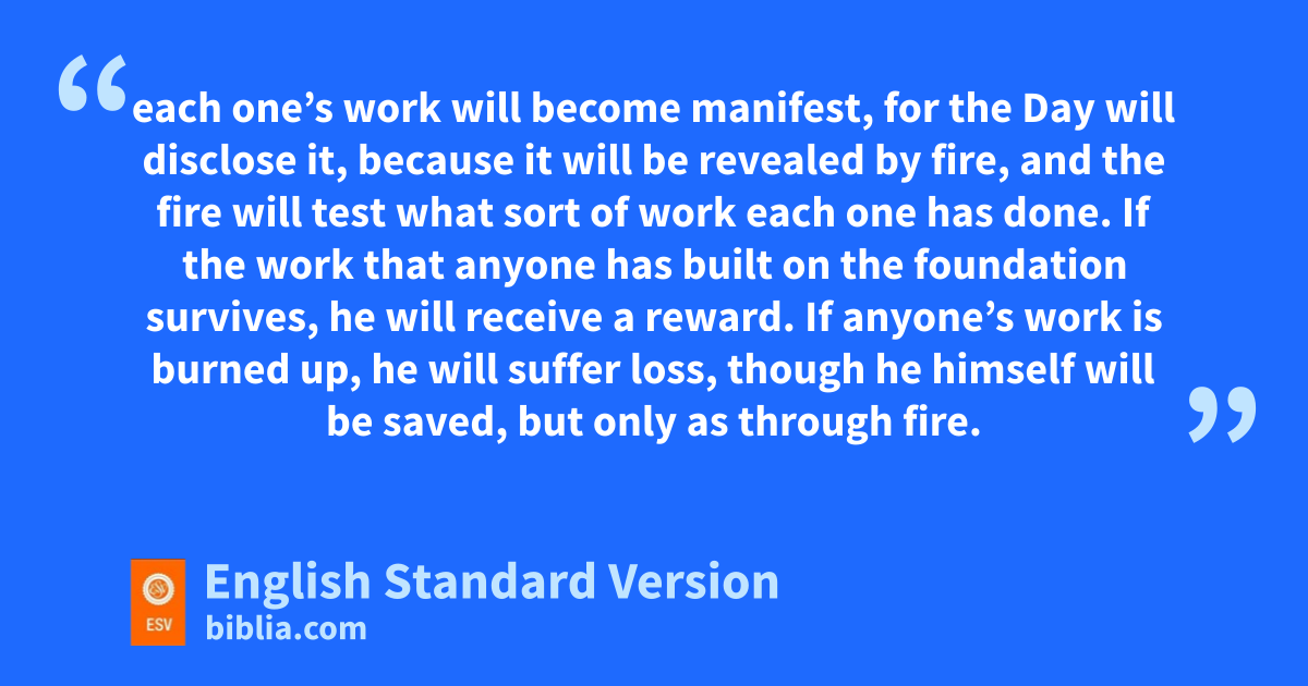 10 rAccording to the grace of God given to me, like a skilled2 master builder I laid a sfoundation, and tsomeone else is building upon it. Let each one take care how he builds upon it. 11 For no one can lay a ufoundation other vthan that which is laid, wwhich is Jesus Christ. 12 Now if anyone builds on the foundation with gold, silver, precious stones, wood, hay, straw— 13 xeach one’s work will become manifest, for the Day will disclose it, because it will be revealed yby fire, and zthe fire will test what sort of work each one has done. 14 If the work that anyone has built on the foundation survives, ahe will receive a reward. 15 If anyone’s work is burned up, he will suffer loss, though he himself will be saved, bbut only as through fire.
