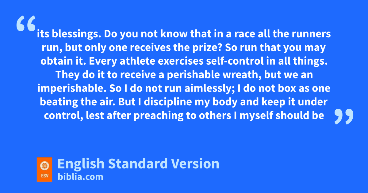24 Do you not know that in a race all the runners run, but only one receives sthe prize? So trun that you may obtain it. 25 Every uathlete exercises self-control in all things. They do it to receive a perishable wreath, but we van imperishable. 26 So I do not run aimlessly; I wdo not box as one xbeating the air. 27 But I discipline my body and ykeep it under control,2 lest after preaching to others zI myself should be adisqualified.